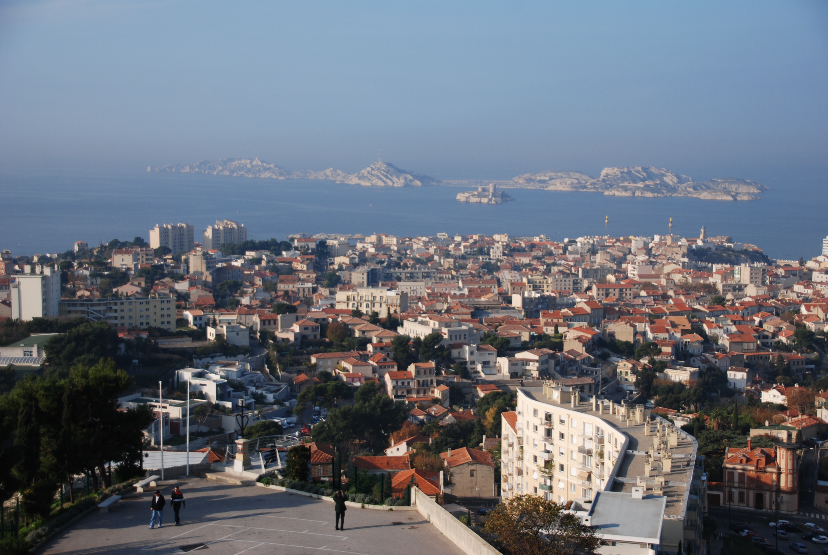 Marseille, France, as seen from the Notre Dame de la Garde Basilica. There’s a fort on one island.