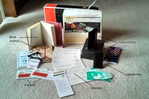 The contents were our trip in a box.  Everything we needed was there, except for our passports (which we have) and some spending loot (still in the bank).  Some unexpected extras were included.  The leather wallets (one for each of us) will hold a passport, driver license, and credit cards easily.  There are plenty of helpful hints on what to pack and do for the upcoming vacation.