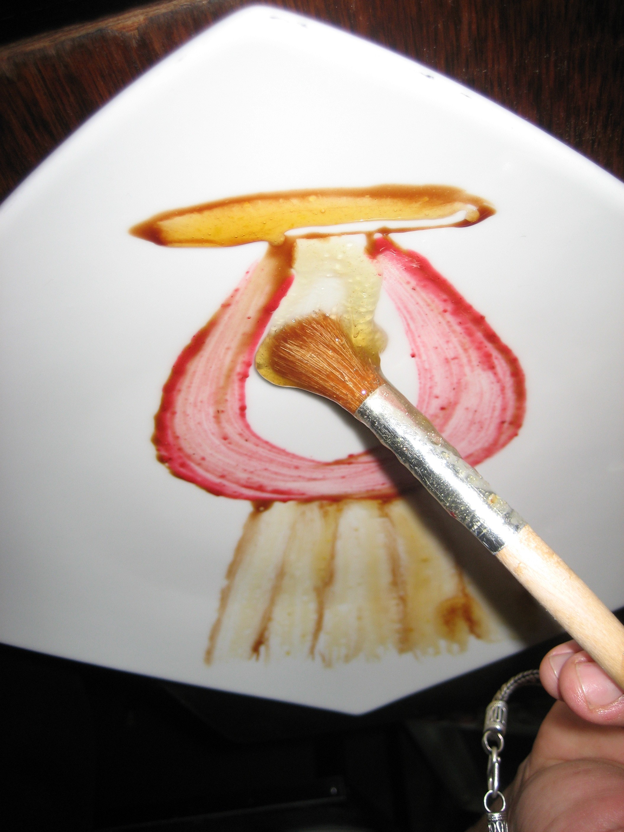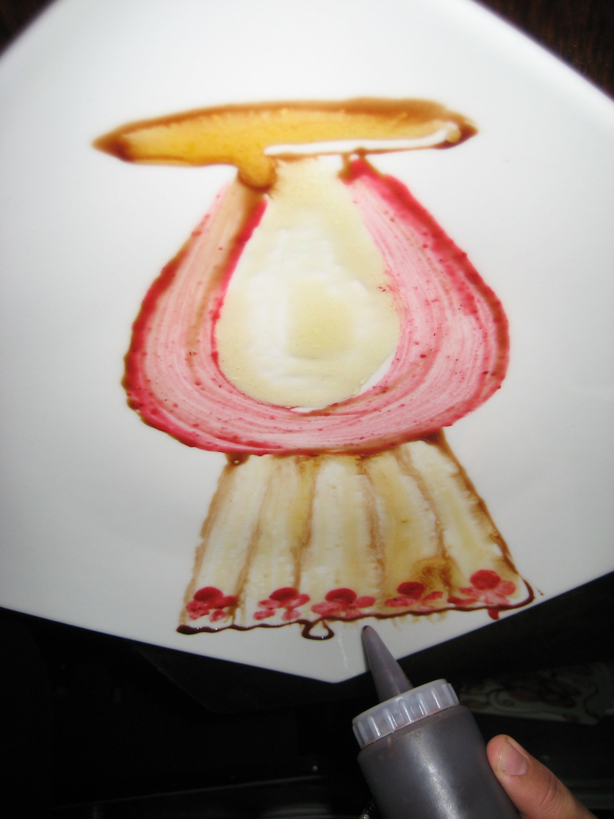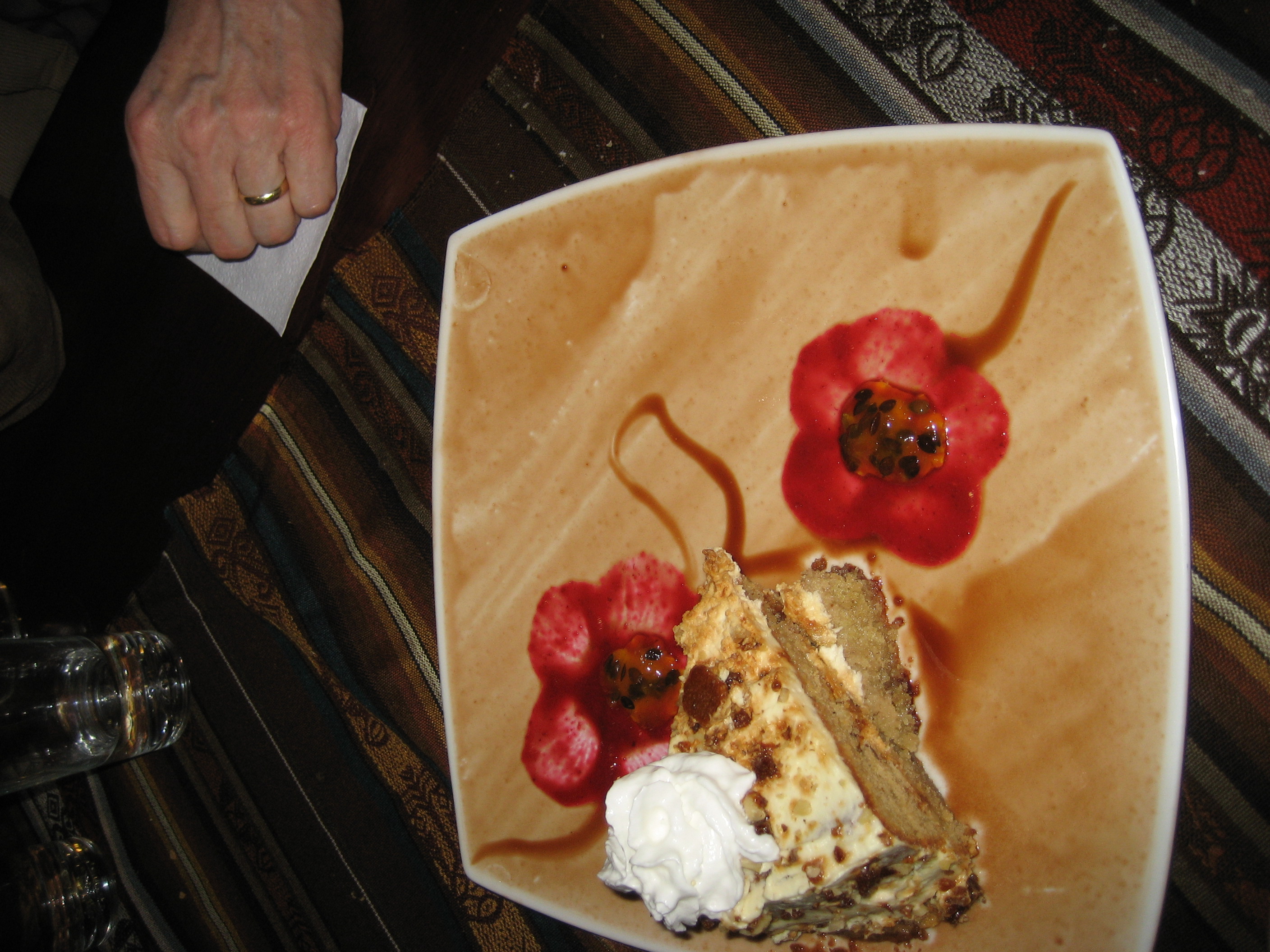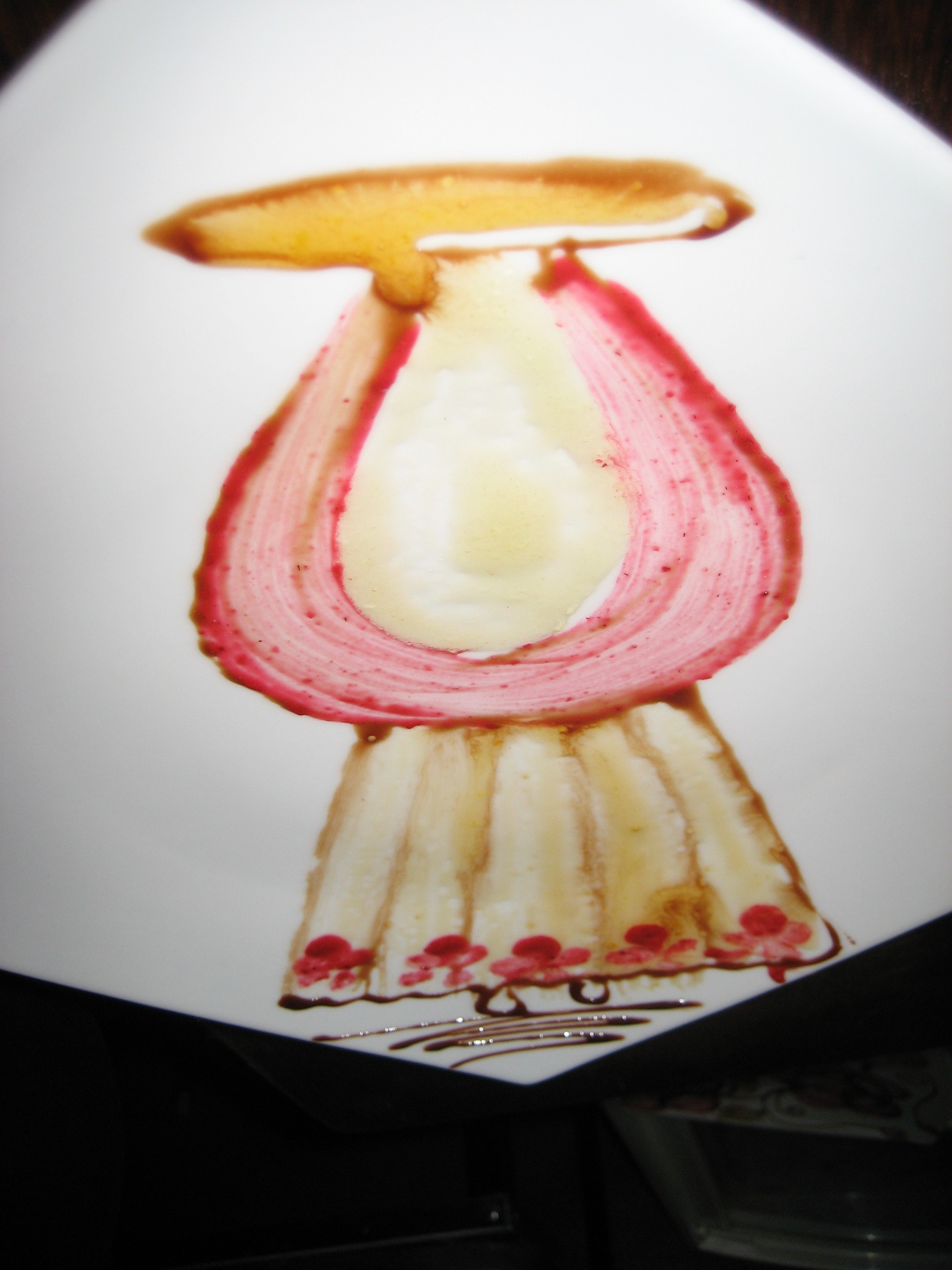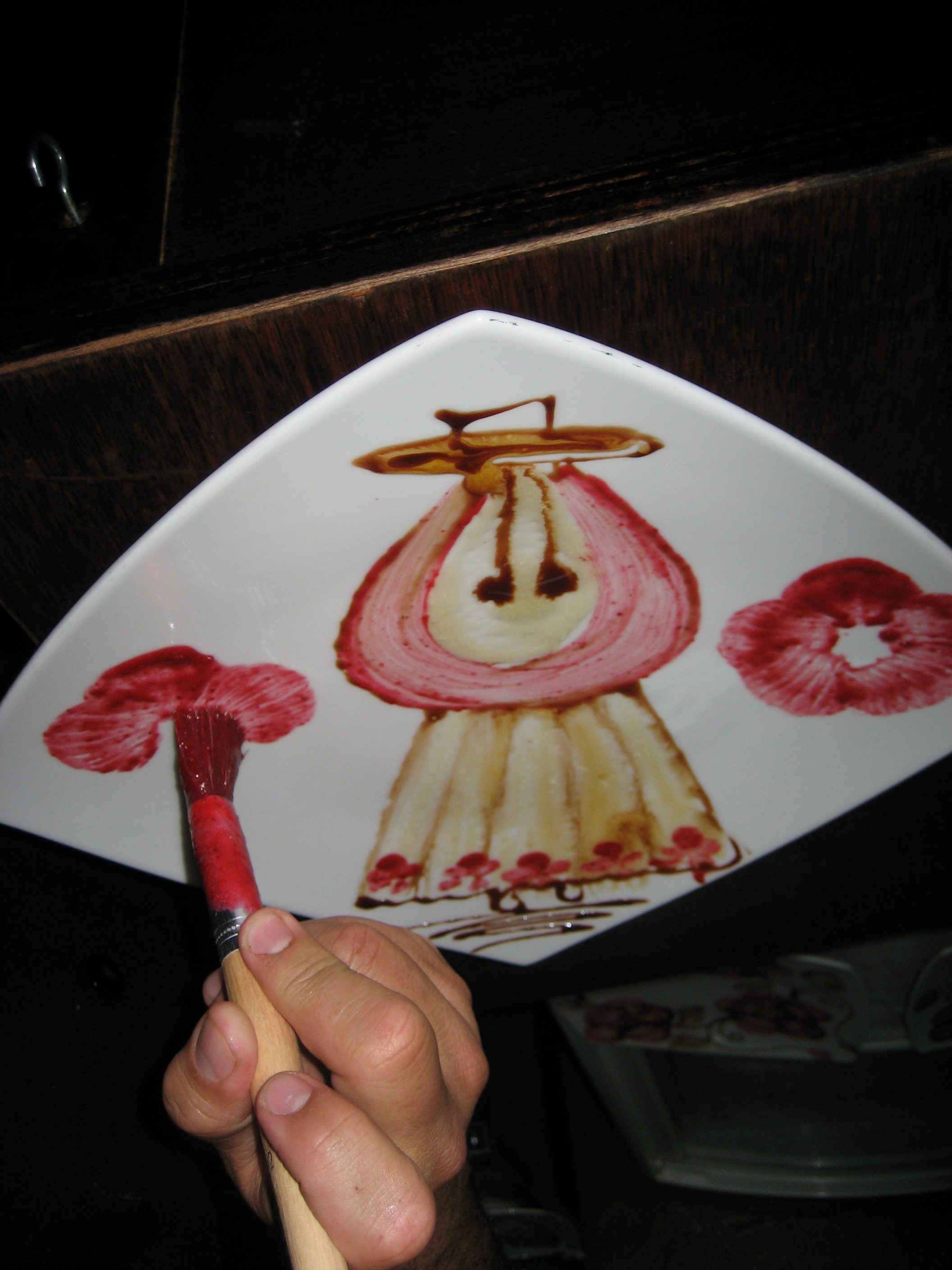 Tonight Two Who Trek joined the rest of the AHI travel group for a fine meal at Tiesto’s Restaurant, currently ranked #2 of 111 restaurants in Cuenca on TripAdvisor.com. After a fine Ecuadorian style meal, the restaurant served desserts on platters hand-painted (yes, painted) by Chef Juan Carlos himself. OK, it’s not real paint he uses but food products — hence the name, edible art.