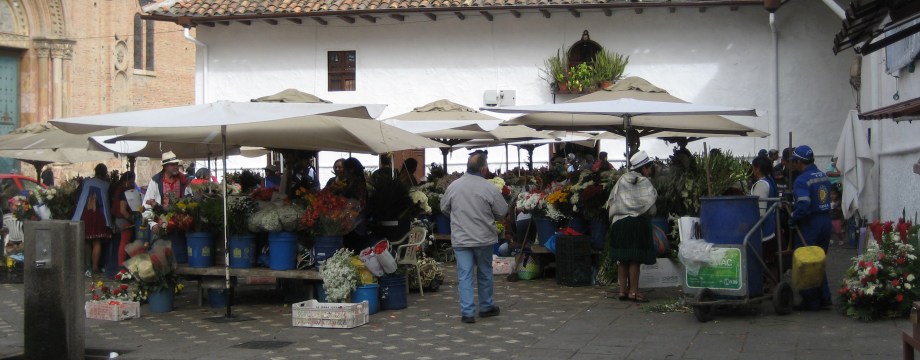 The traditional Flower Market is on Calle Sucre, across from the new Cathedral. The market is in a small open-air plaza in front of the Church of El Carmen, a colonial era church. This square is adorned with the façade of the church and the church is made of carved stone.