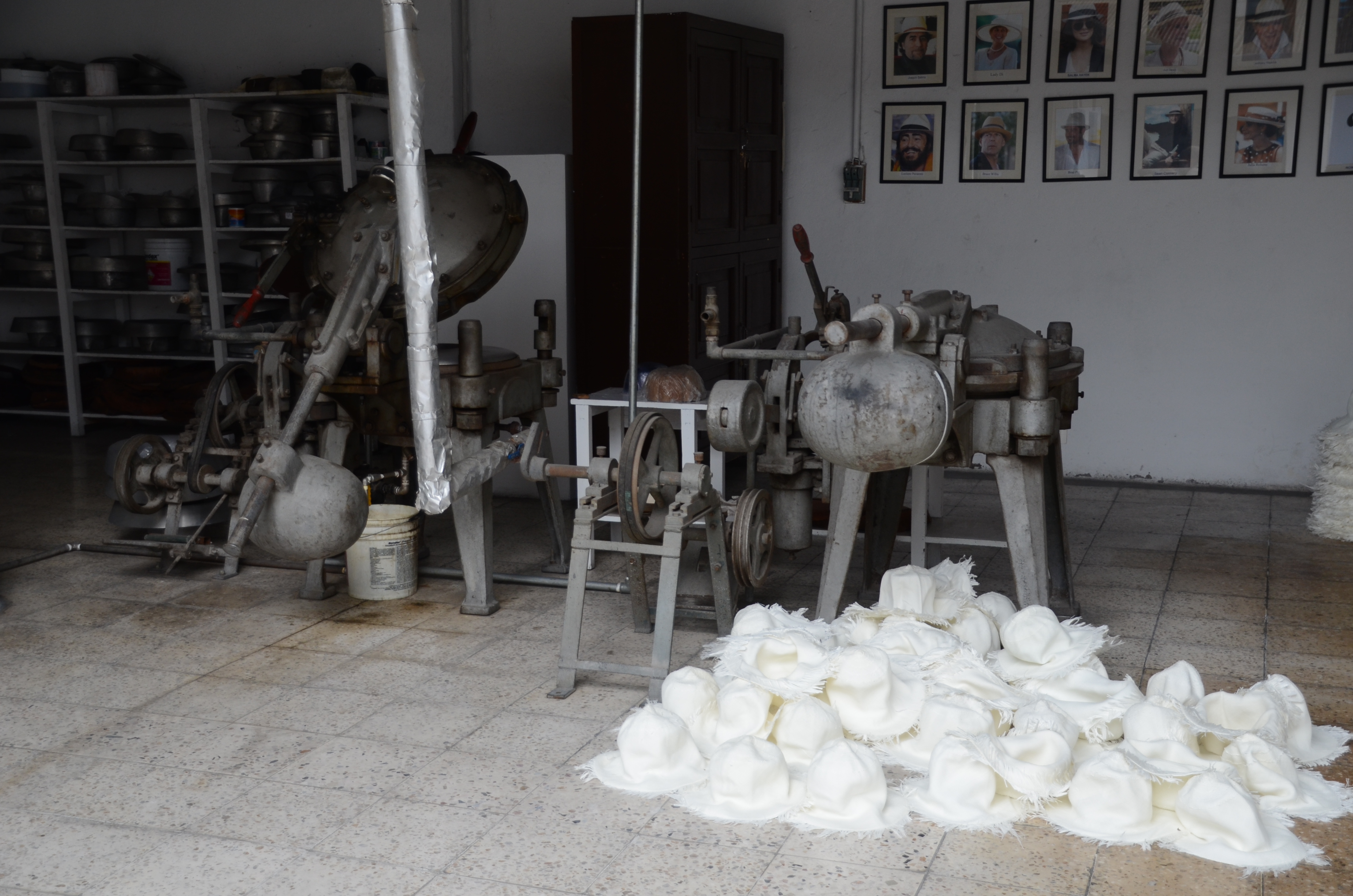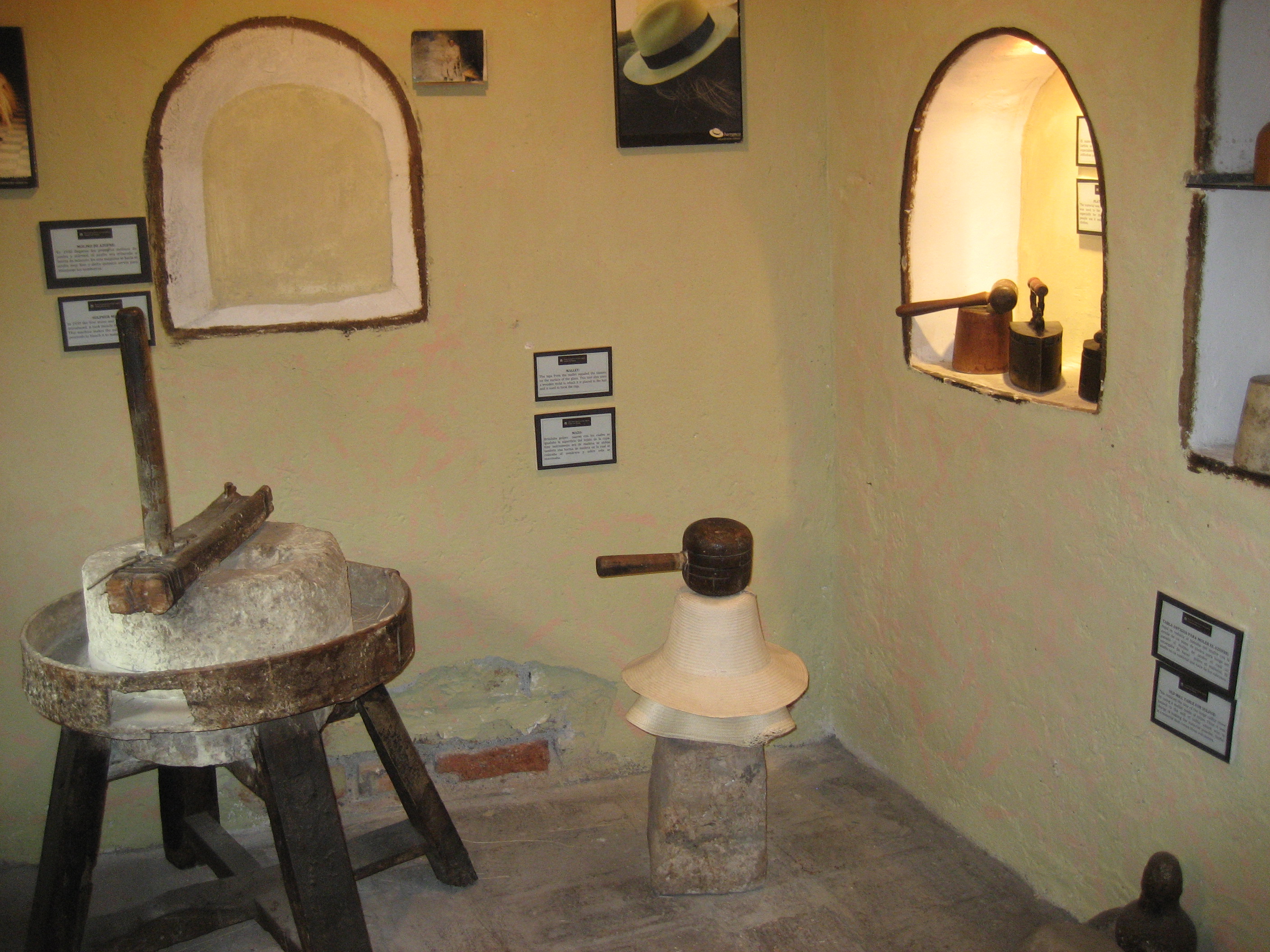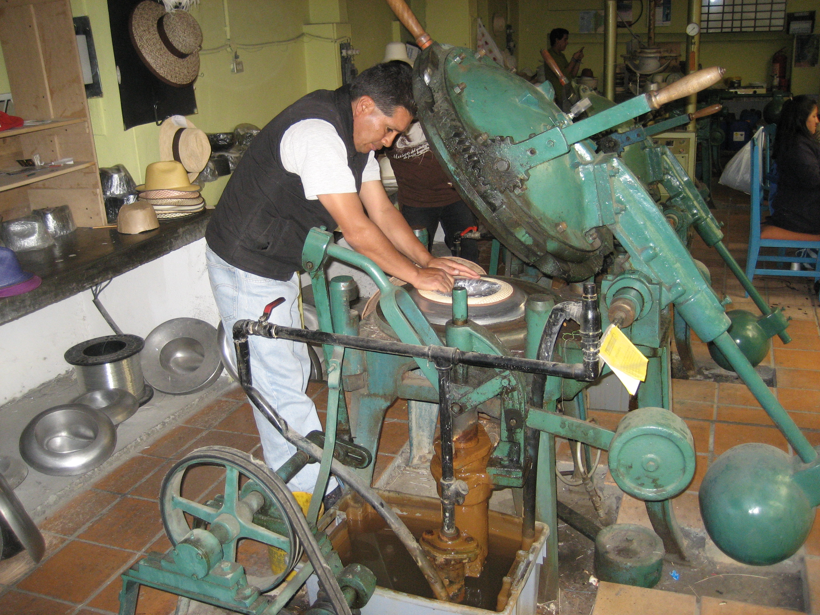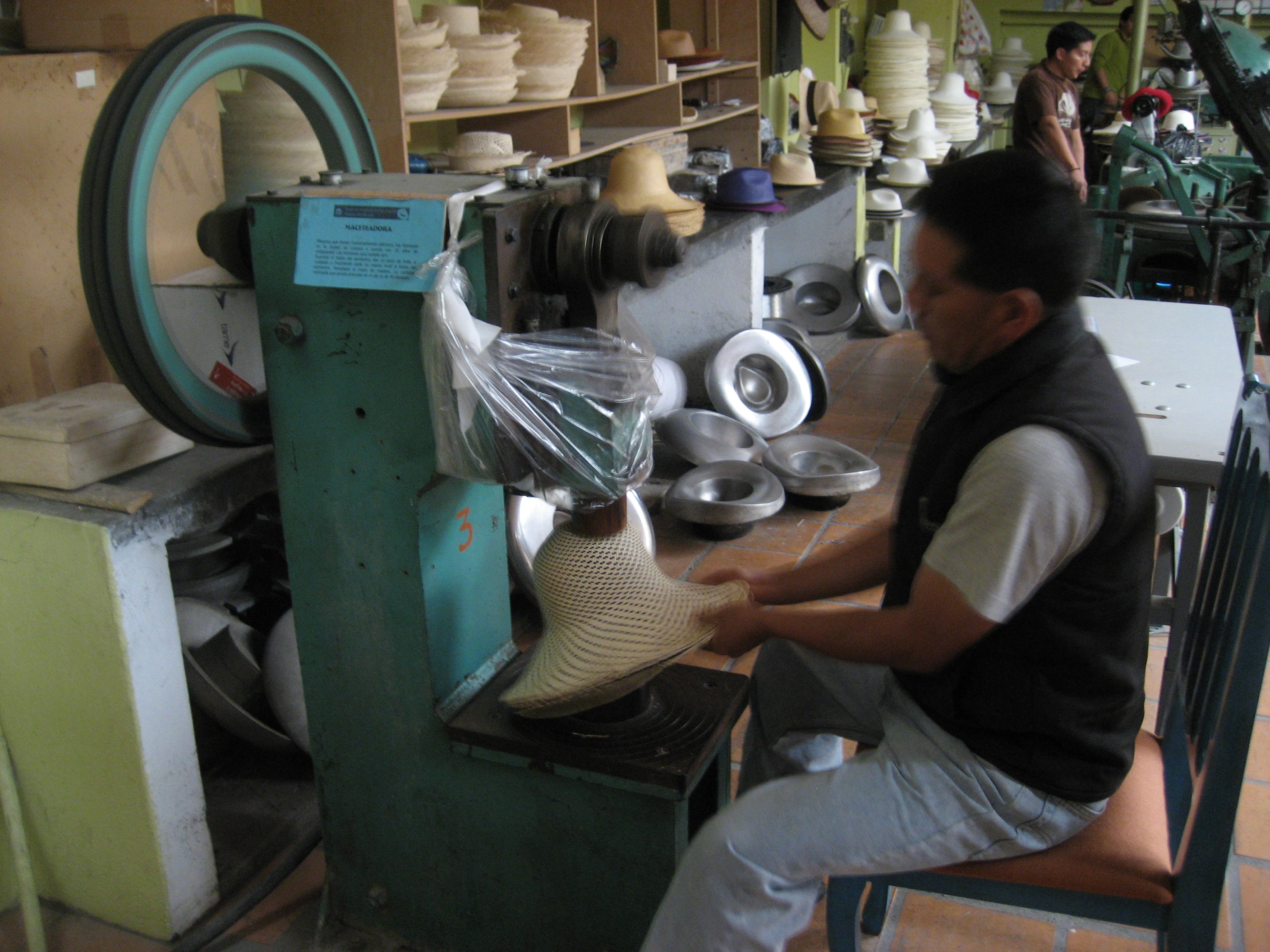 A lovely chola cuencana shows how hats are woven from straw. In reality, the weaving is not done at the hat factory. Women create the hats at home, then sell them to the factories for a small price.