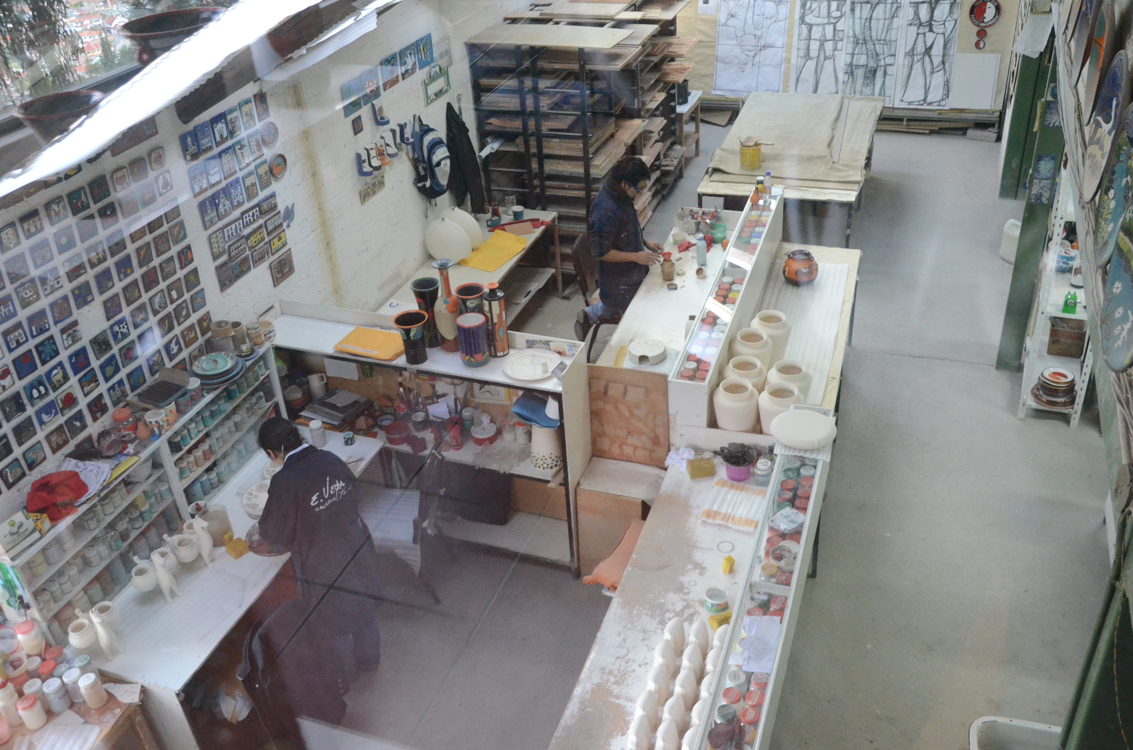 After viewing the gallery, you can tour the showroom. Up on the second level, you can view the activity in the workshop: