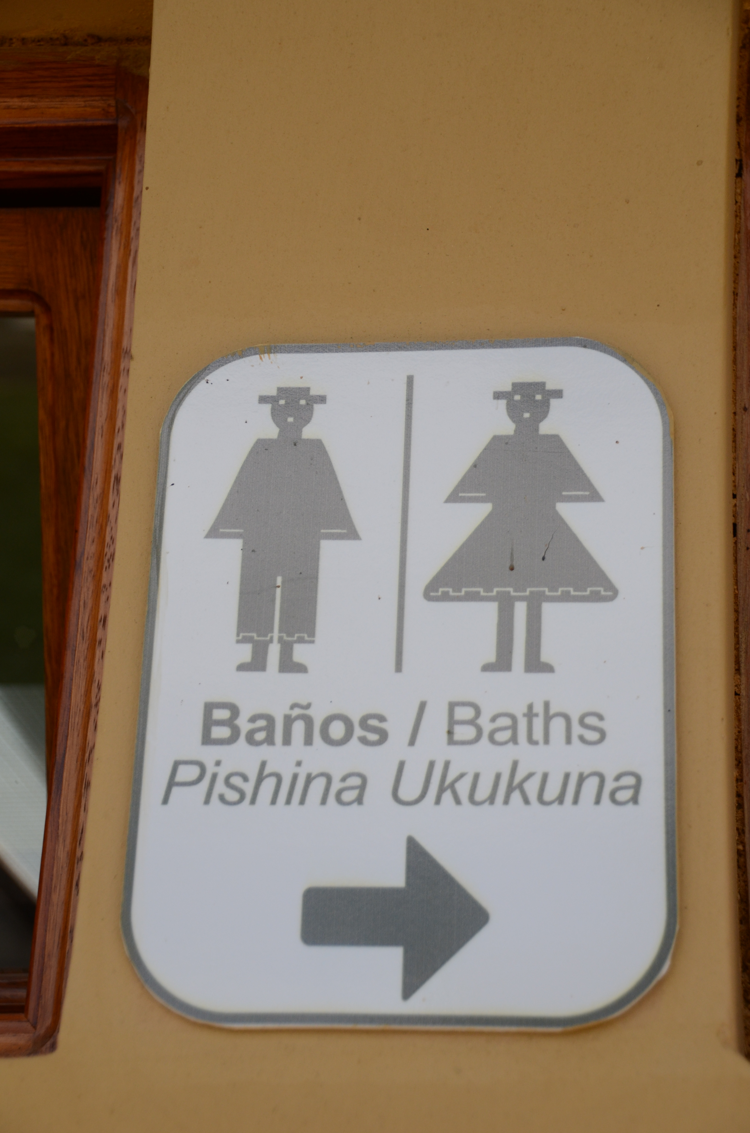 Bathroom sign in Spanish, English, and Quichua -- most signs at Ingapirca had all three languages