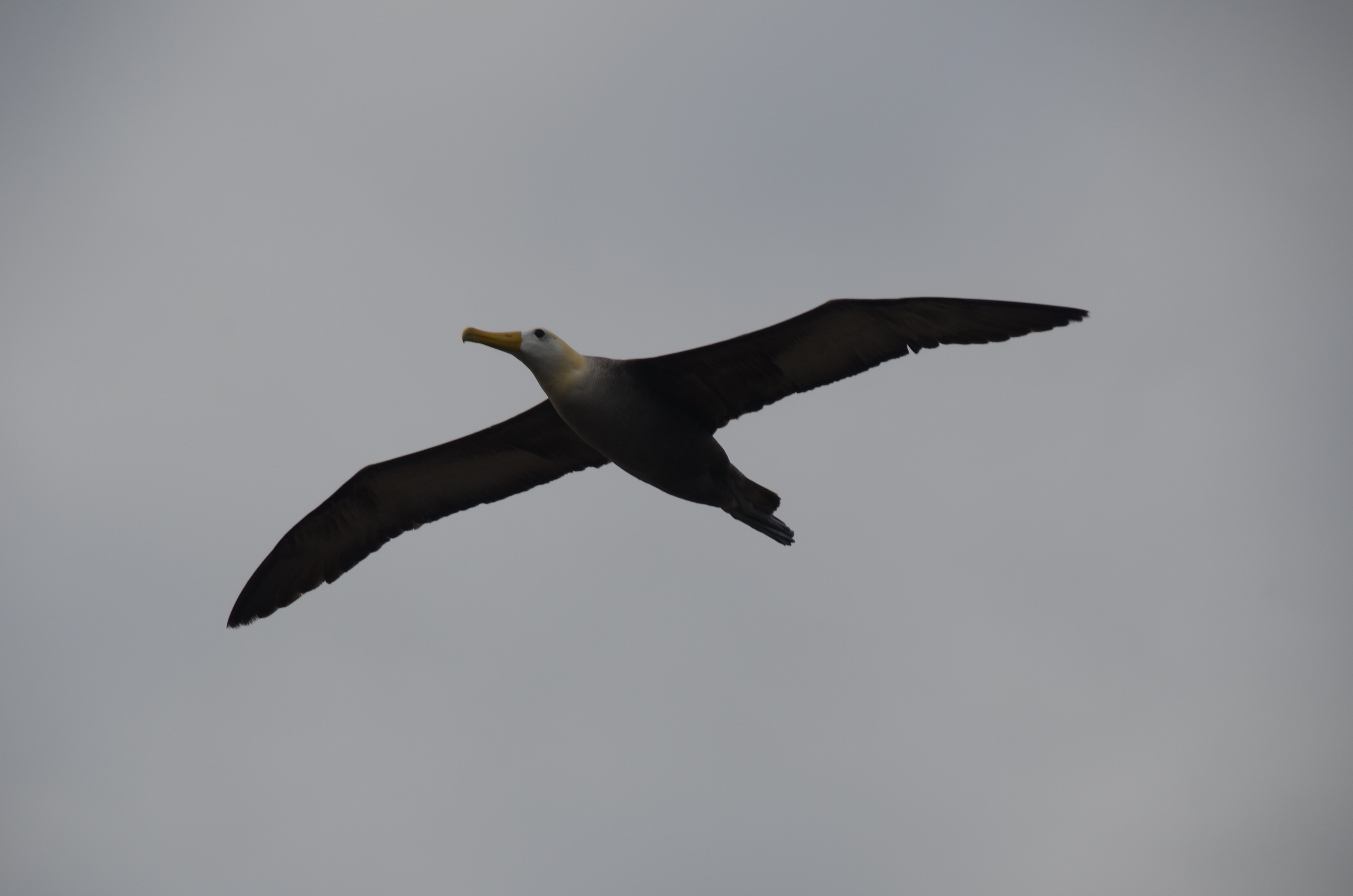 Waved Albatross nest predominately on Española Island. They are the only albatross in the Galápagos and coastal regions of Peru and Ecuador. Their typical wingspan is over seven feet and they can live for forty years. Their feet are blue, although not nearly as vibrant a blue as the blue-footed booby. They soar in wind currents and can stay in flight for long periods of time. Waved Albatross have been known to travel over 60 miles from the nest, to find food for their chicks.