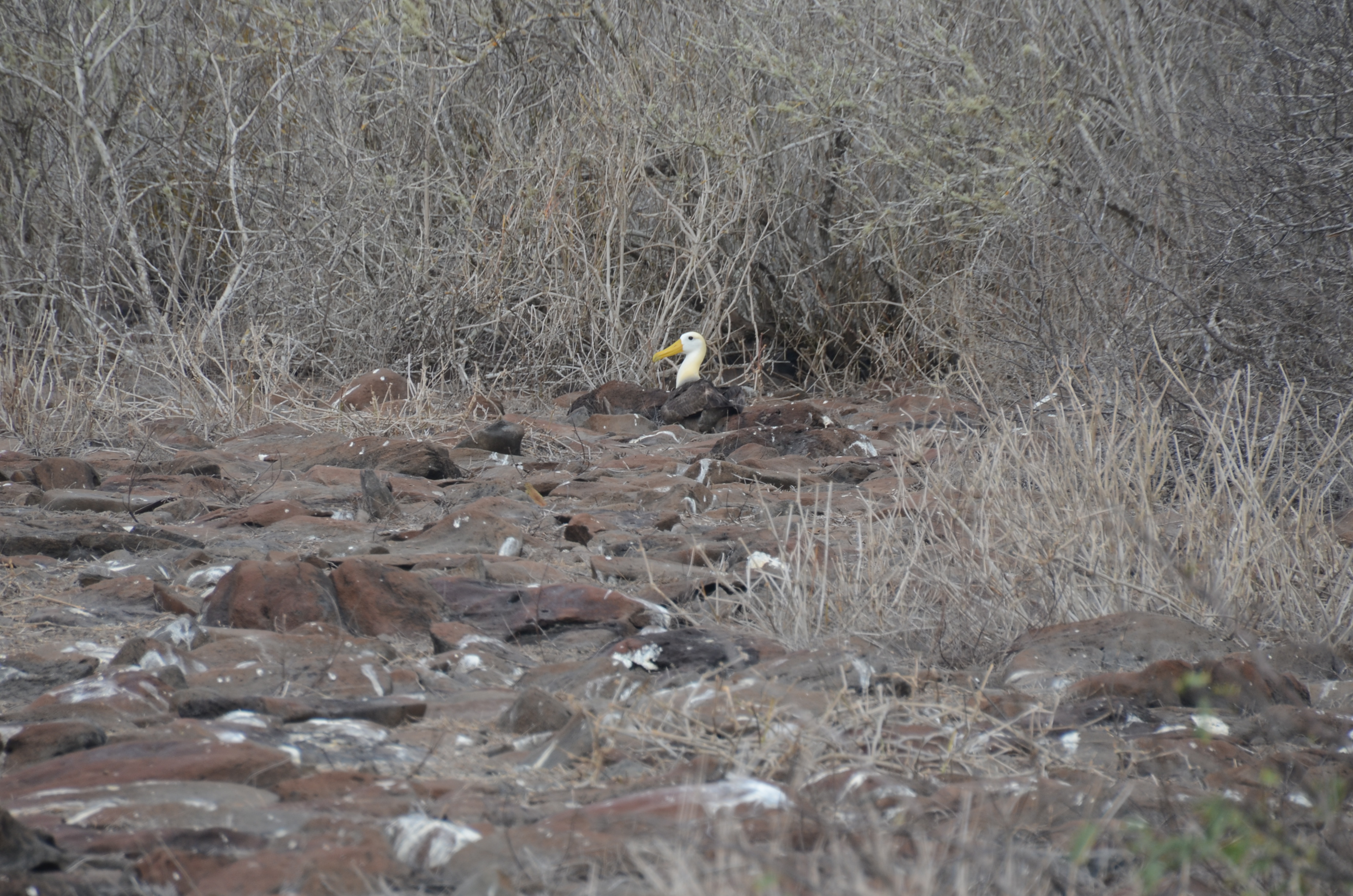 A waved albatross tends to her egg. There isn’t really a nest; the albatross turns the egg by rolling it along the ground, ending about 250 feet from where it started.