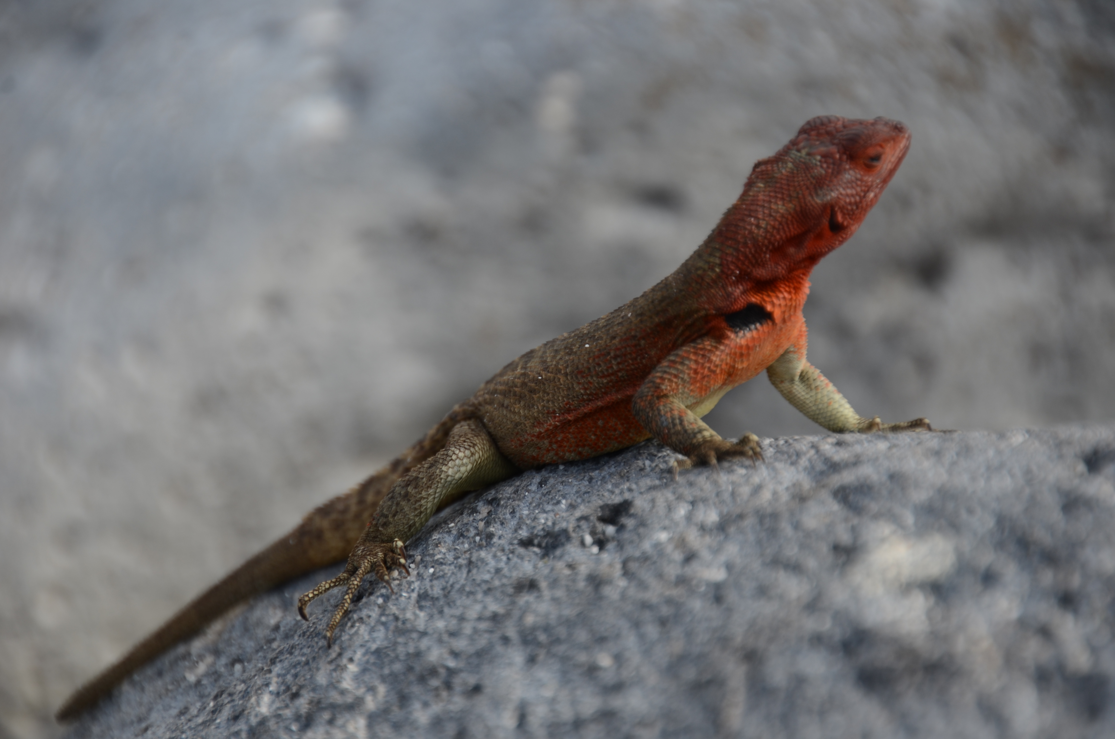 Lava lizards scurry across volcanic rocks that line the seashore. Males are larger than females. The females are distinguishable with bright red skin under their throats and the males are often seen doing “push-ups” as trying to protect their territories from other males. Many lava lizards inhabit the same rocky precipices as the marine iguana.
