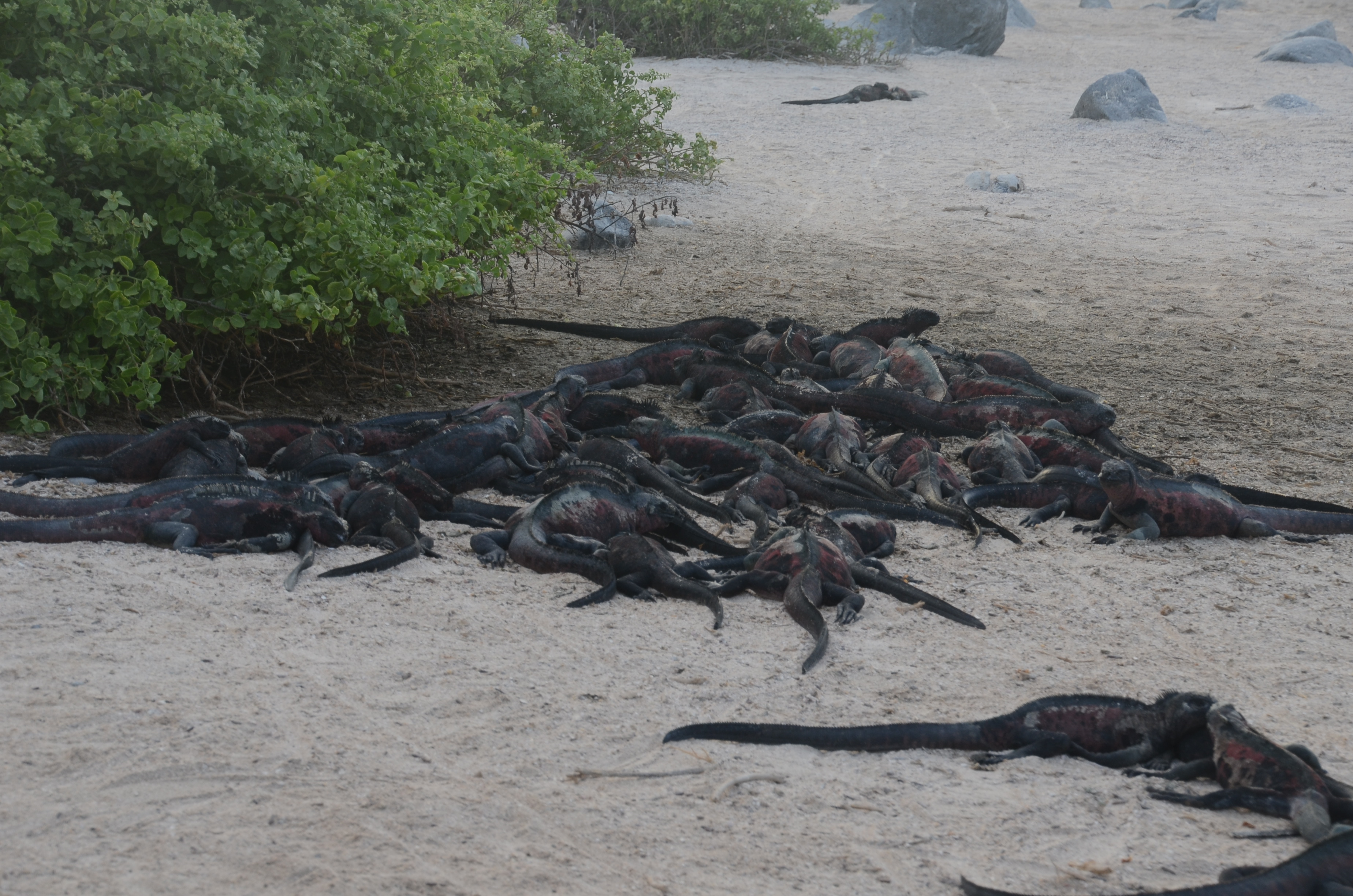 A male marine iguana (top) defends his harem (most of the other lizards) from interloping males seeking amorous encounters