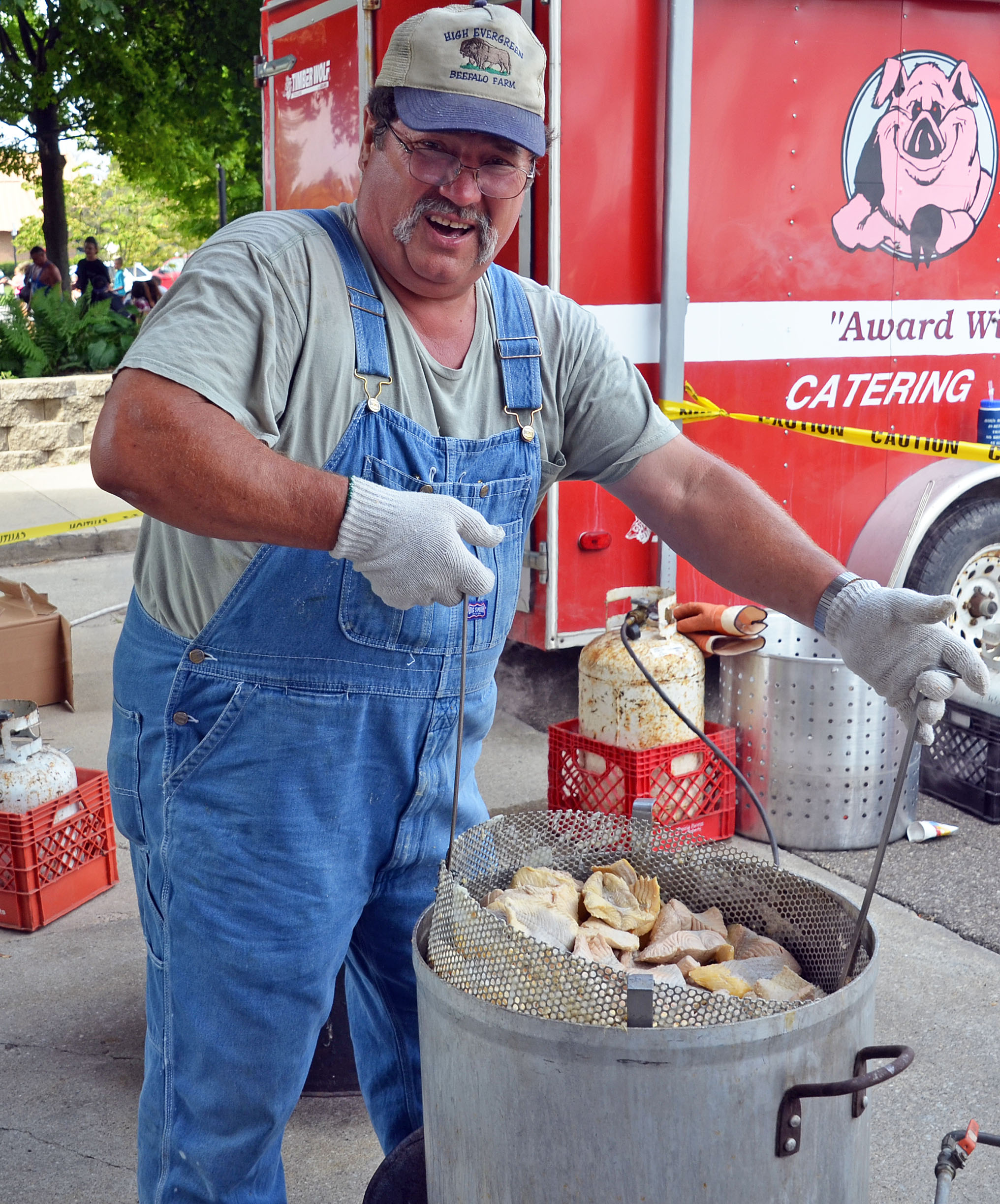 Proceeds from this annual event help support the South Haven area in many ways like academic scholarships, local youth athletics and community fireworks. The process starts in May at the SHS Pro/Am Tournament. All fish caught on the first day of the two-day tournament are donated to the Fish Boil. The designated blue fish trailer (shown below) is filled with the catch-of-the-day which can be salmon, steelhead or trout.