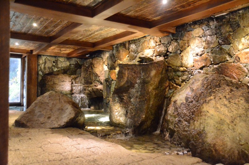 Waterfall inside lower level of restaurant.