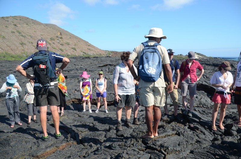 Our guide (with the white hat, blue backpack, and bare feet) discusses rope lava development with our gang from the ship.