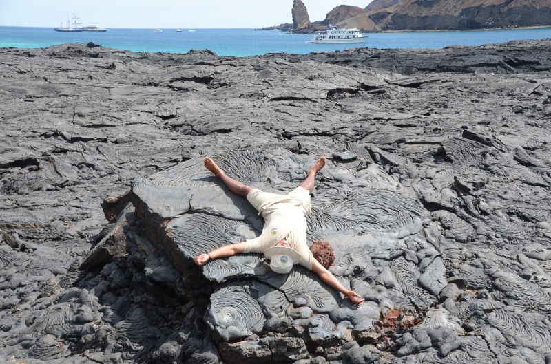 Our guide upside-down on the lava field. Our ship, the MV San Jose, in in the top center of the photo.